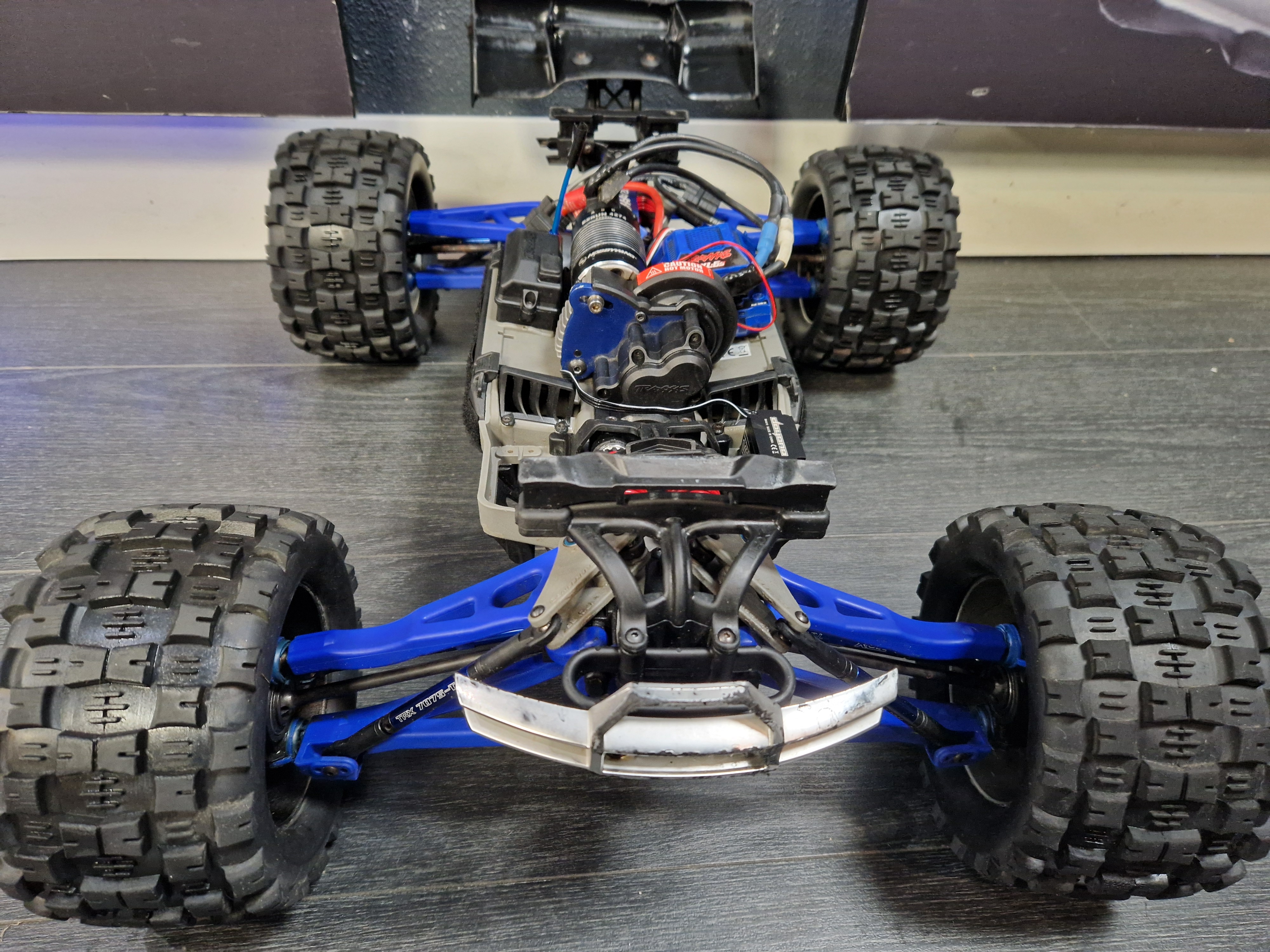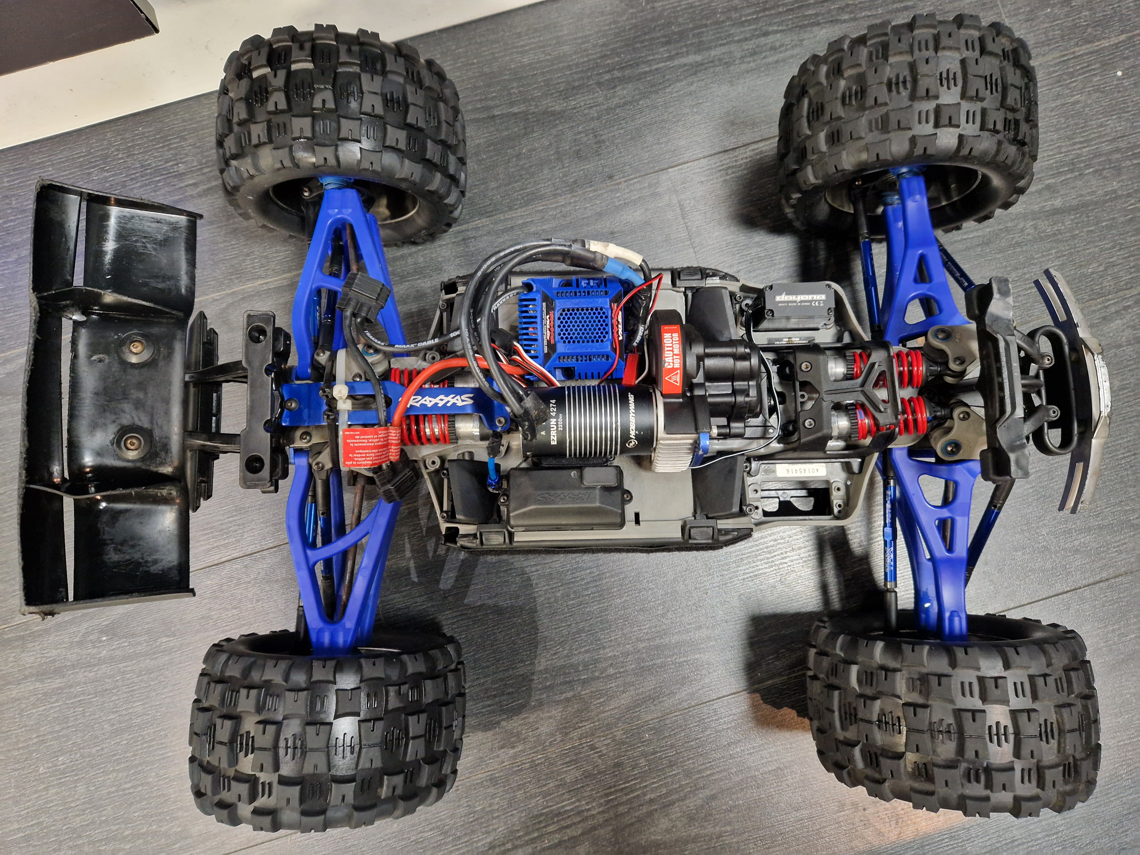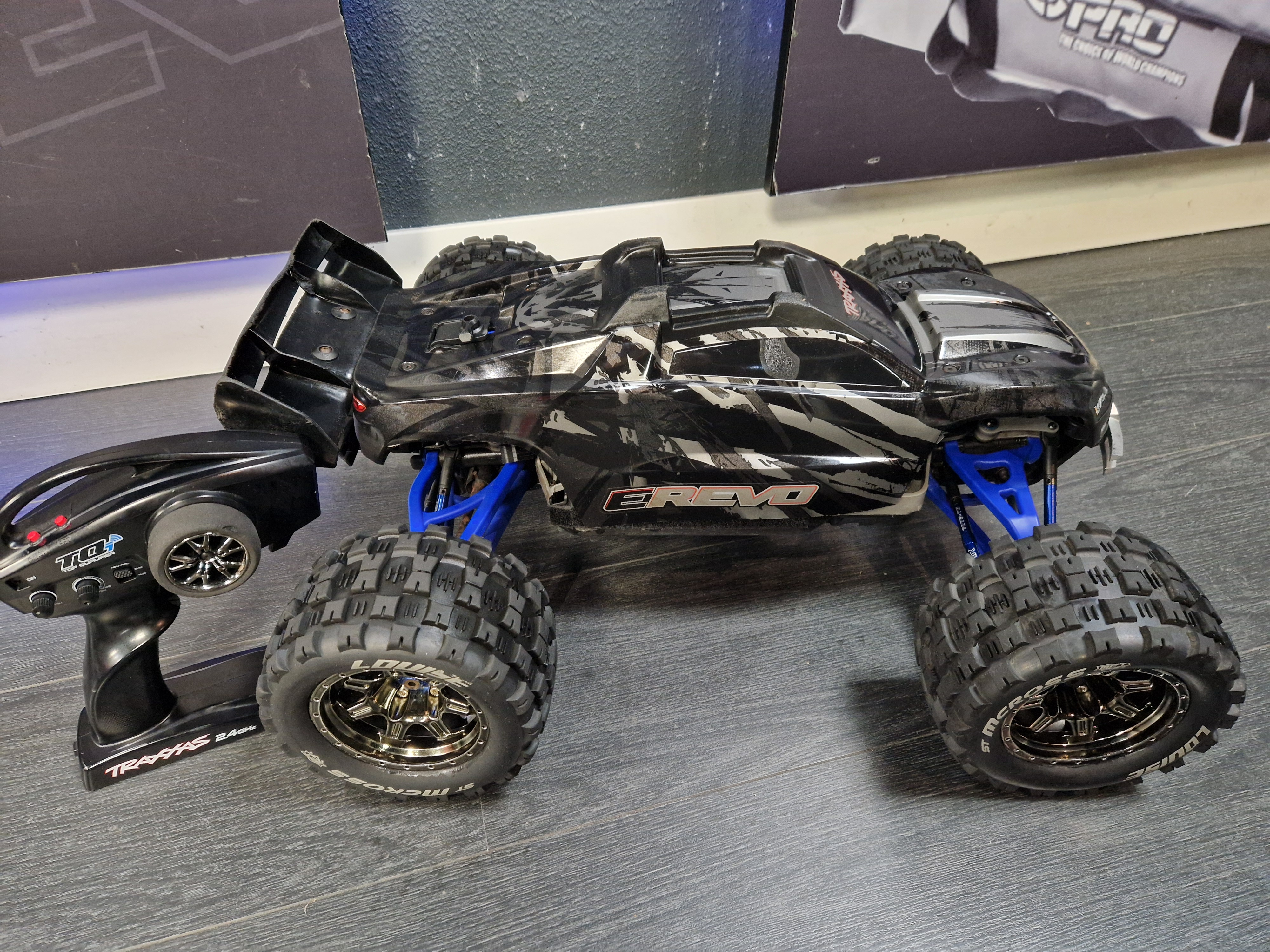 een Traxxas E-Revo 2.0 in nette staat, compleet met diverse upgrades en opties voor betere prestaties en duurzaamheid.
