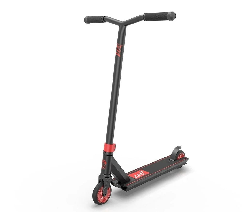 Een stuntstep ontworpen voor trick- en freestylegebruik, uitgevoerd in zwart met rode accenten. De step heeft een stevig frame en wielen die geschikt zijn voor zowel indoor- als outdoorgebruik. Het stuur is verstelbaar, en de step is voorzien van een betrouwbare rem, wat zorgt voor controle en veiligheid tijdens het rijden.