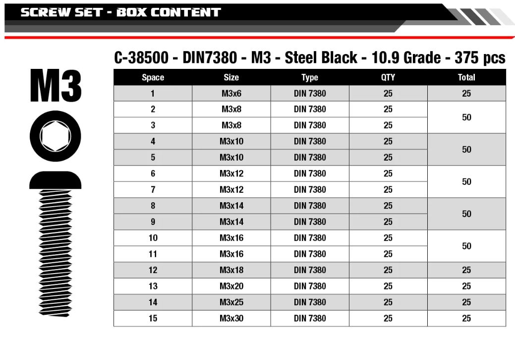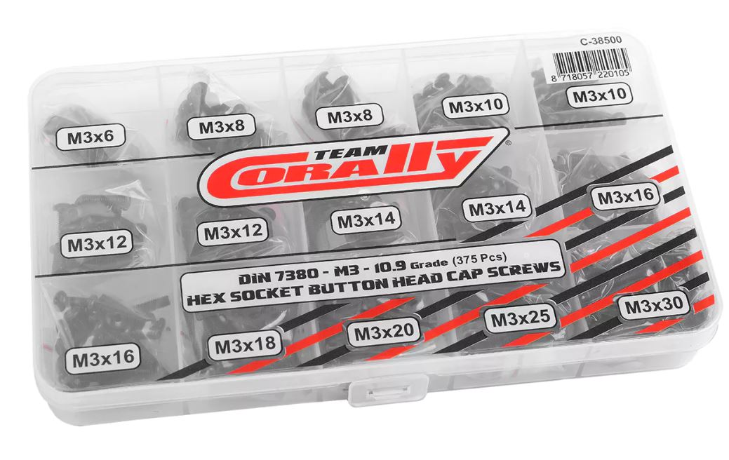 Reviews over Team Corally Team Corally - Screw Set M3 - Hex Button Head - DIN 7380 - Steel Black - 10.9 Grade - 15 Sizes - 375 pcs